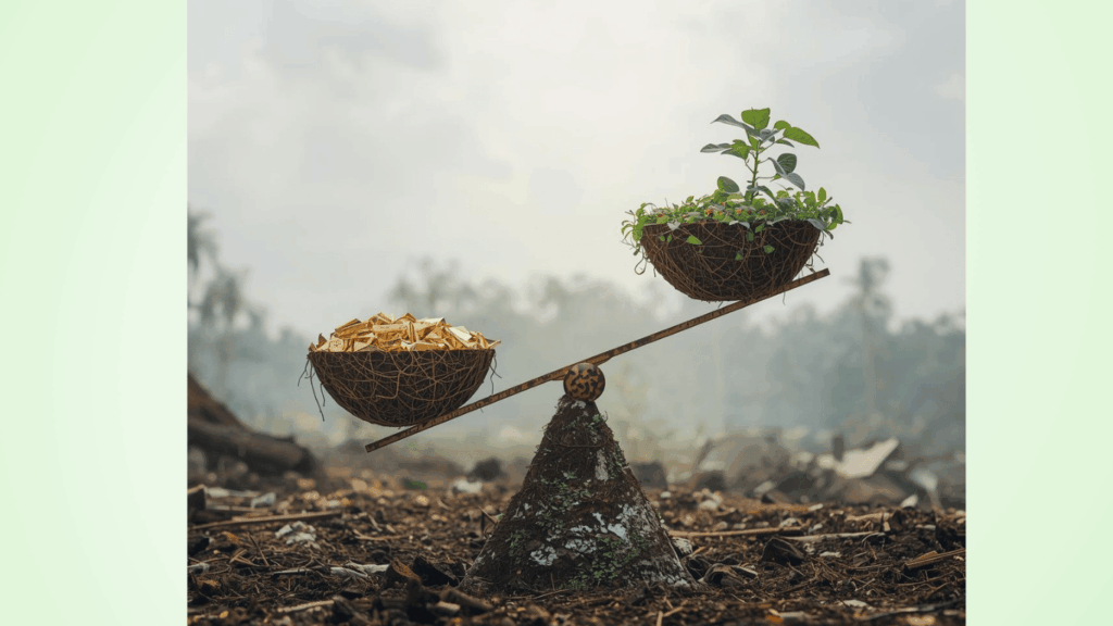 しかし、現実は理想通りには進みません。地方の山間部を埋め尽くすメガソーラー。その黒いパネルの海は、かつて水を保ち、土砂崩れを防いでいた森林を伐採した跡地に広がっています。「地球環境(CO2削減)」を守るために、皮肉にも「地域環境(防災機能・景観)」が破壊されるというパラドックス(逆説)。大雨のたびに濁流に怯える住民の姿は、教科書の美しい挿絵には決して描かれることはありません。