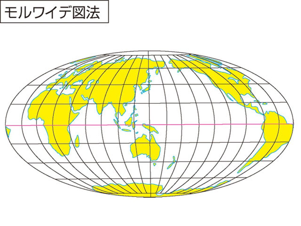 モルワイデ図法:面積だけは正確ですが、形はいびつです