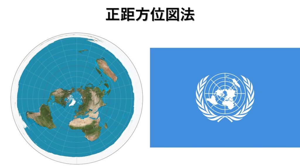 国連の旗にこれが使われている理由は、「中立」を装いつつつ、「国連本部のから、全ての加盟国を最短距離でロックオンできる」というメッセージを込めているのかも。